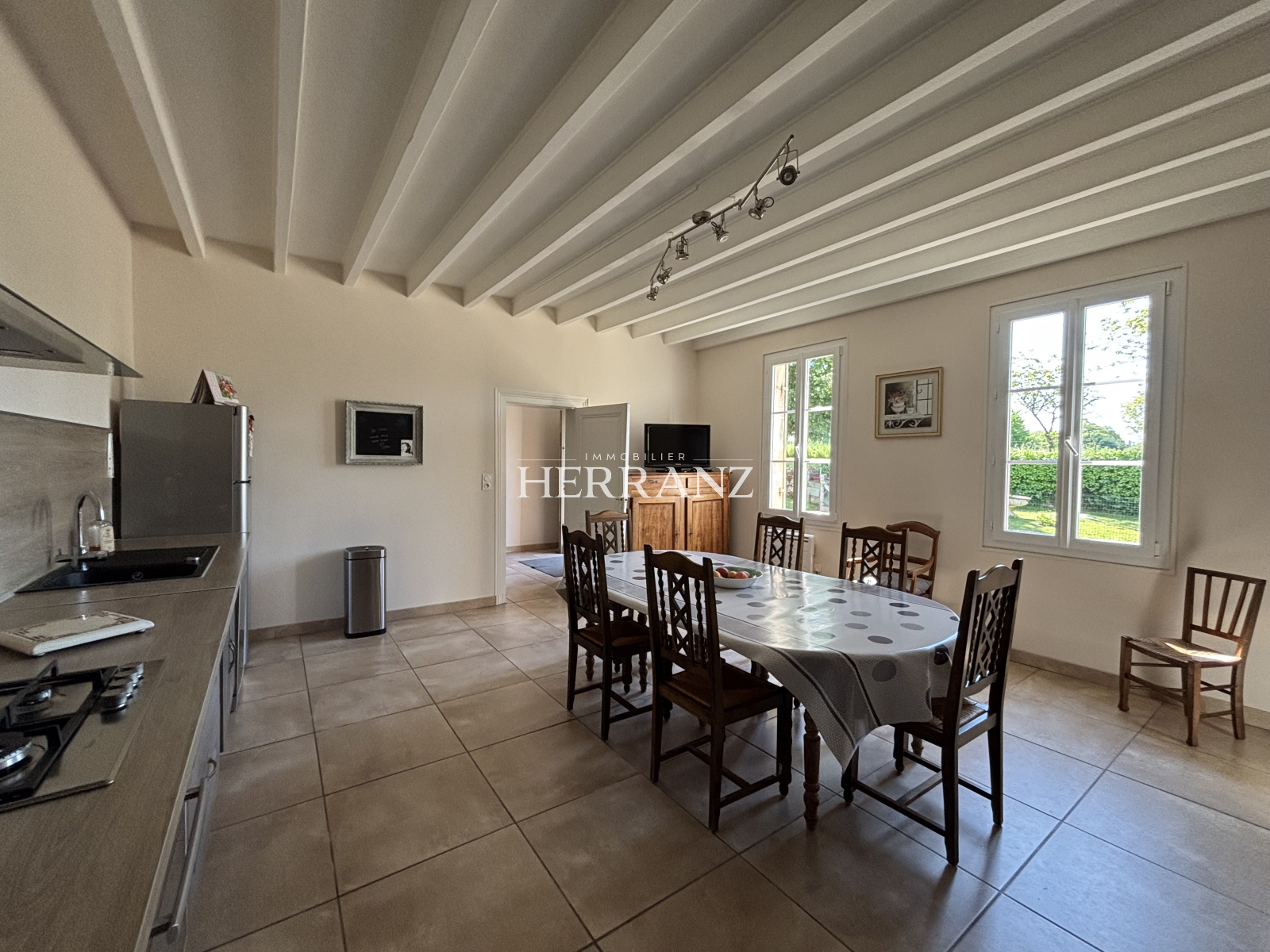 Dès l’entrée, la maison séduit par la générosité de ses volumes et la luminosité omniprésente. Le rez-de-chaussée accueille un vaste hall, un salon baigné de lumière, une cuisine équipée, un cellier, une salle d’eau, des toilettes séparées ainsi qu’une seconde cuisine offrant la possibilité de créer une quatrième chambre ou un studio indépendant.