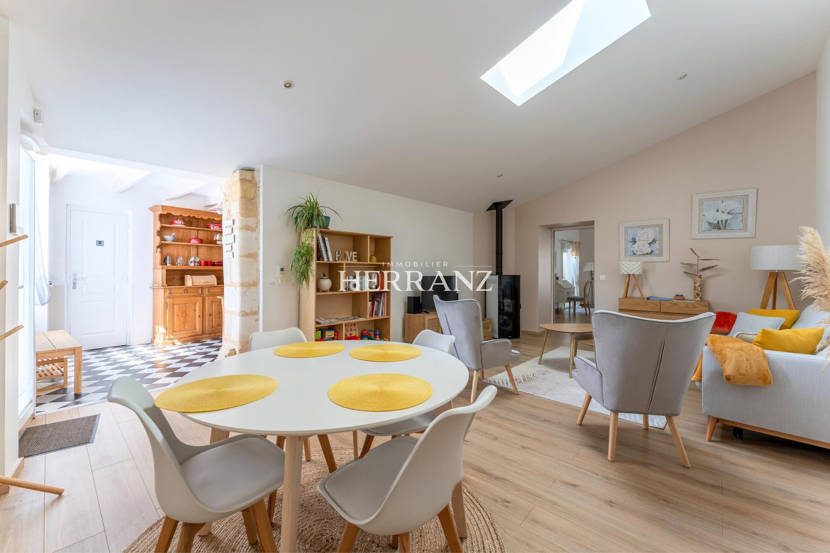 Dès l’entrée, le charme opère : belle hauteur sous plafond, parquet, pierre apparente, cheminées et poêle à bois composent une atmosphère chaleureuse et raffinée.