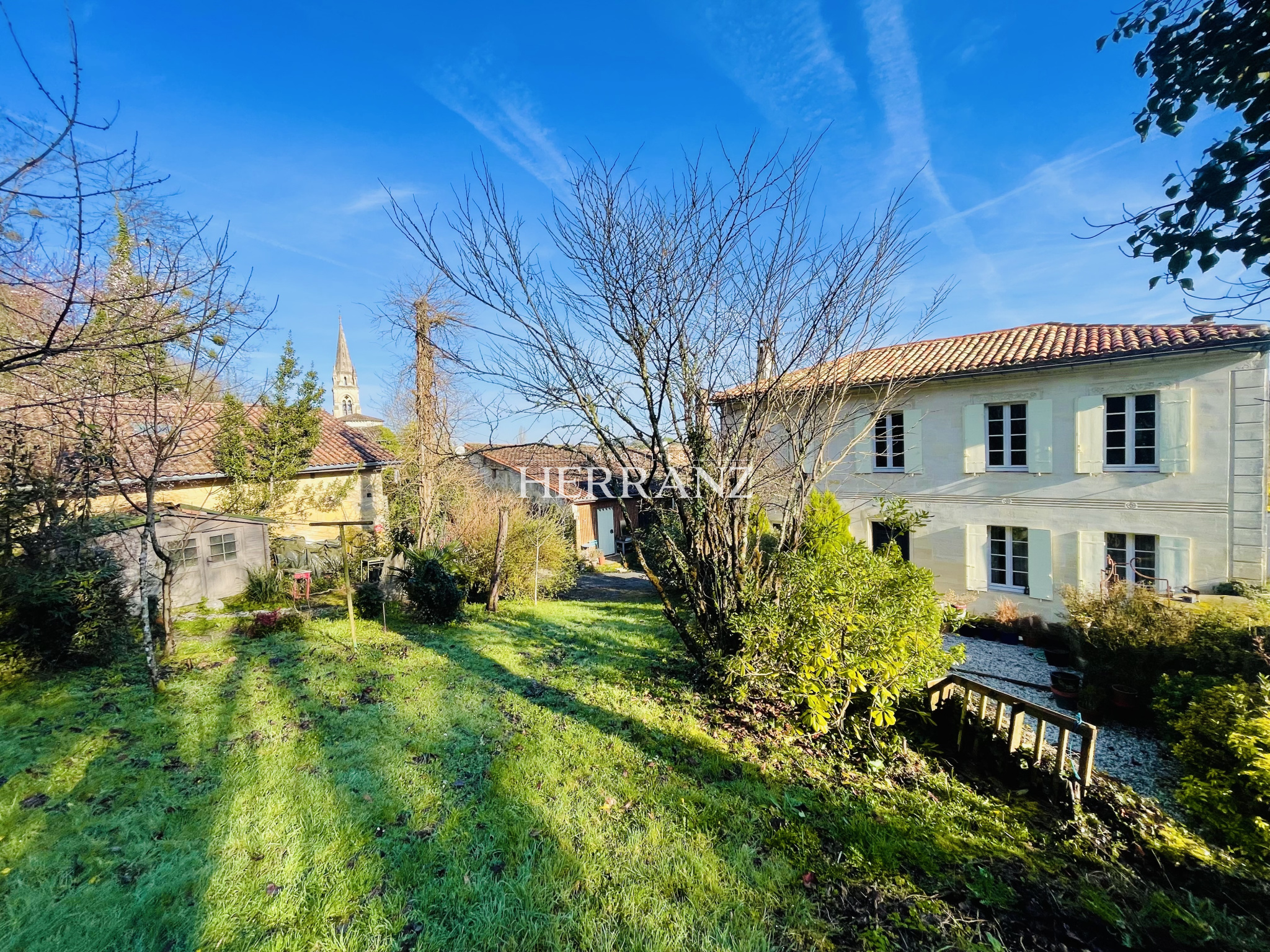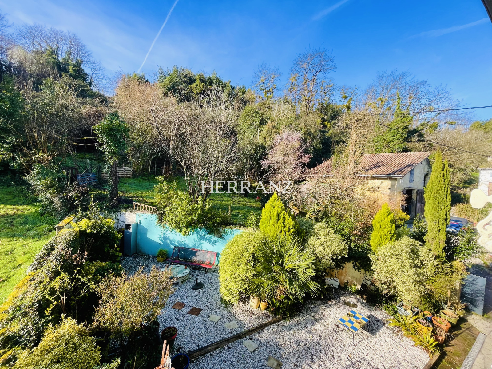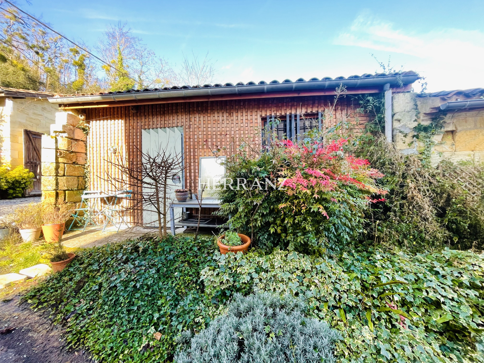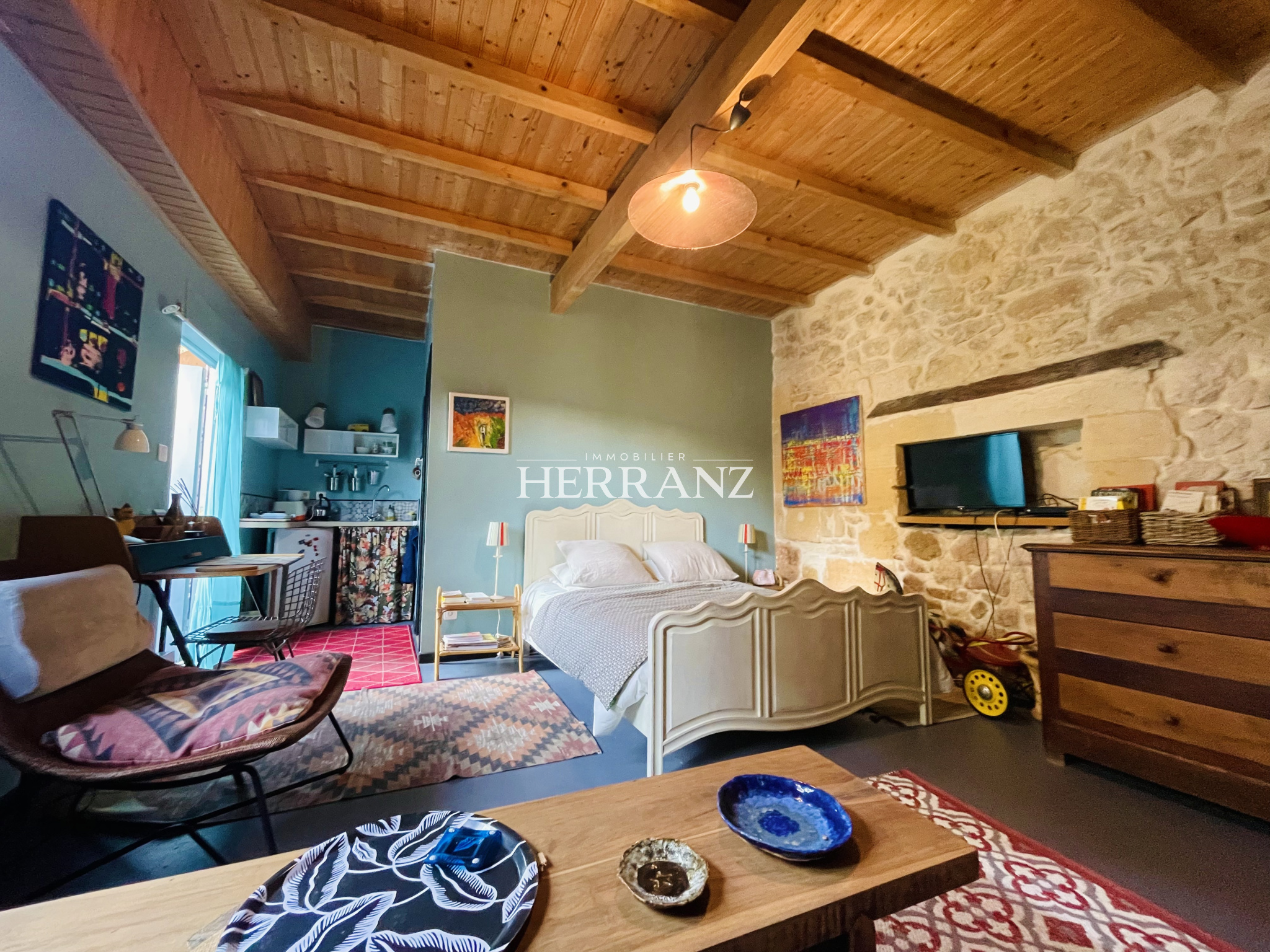 Maison en pierre avec piscine et vue imprenable sur les vignes.